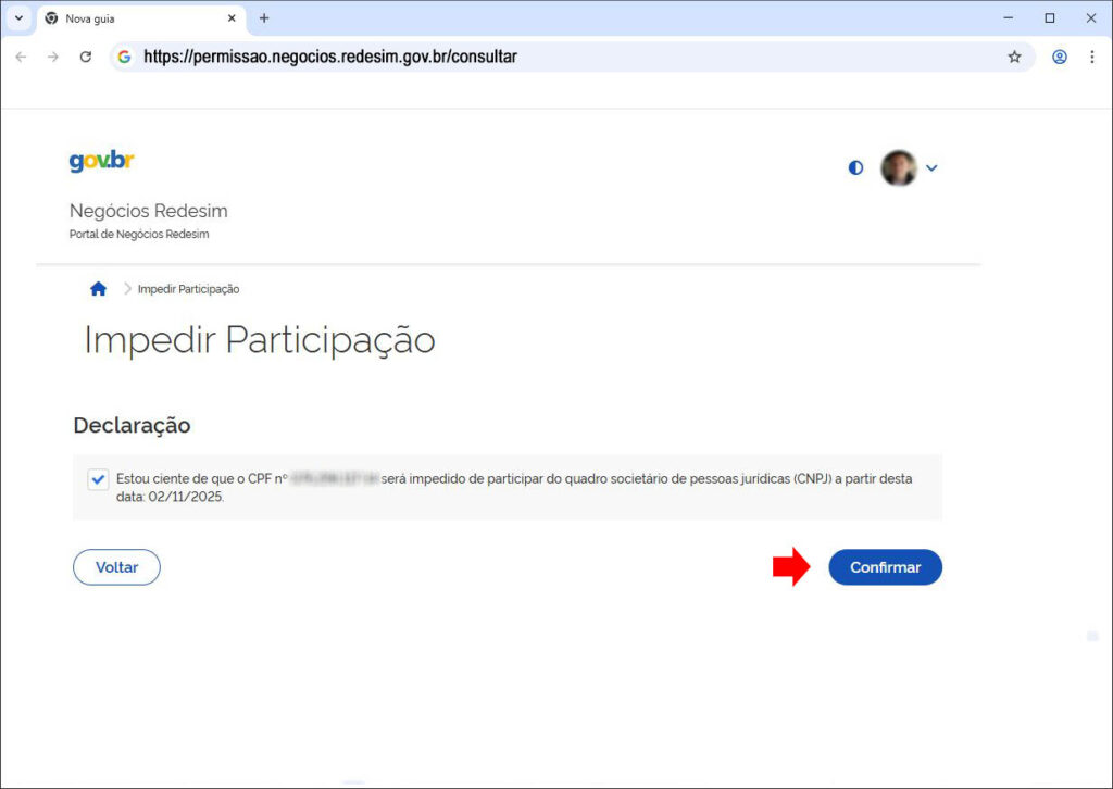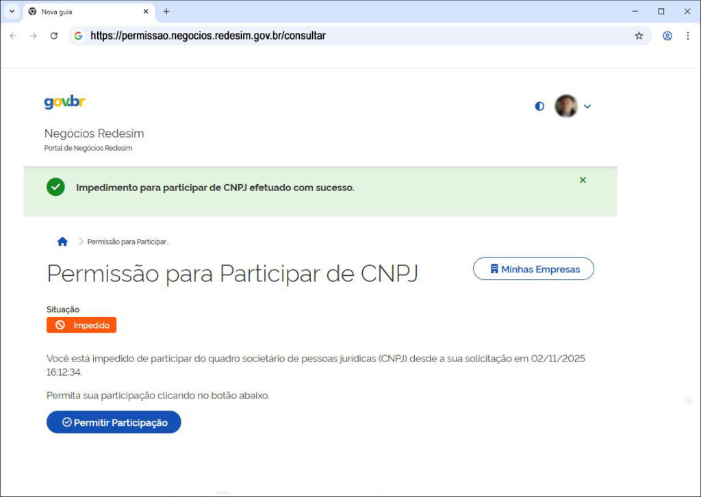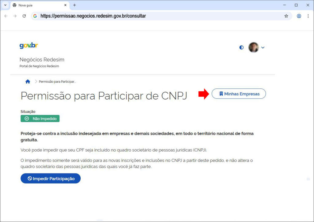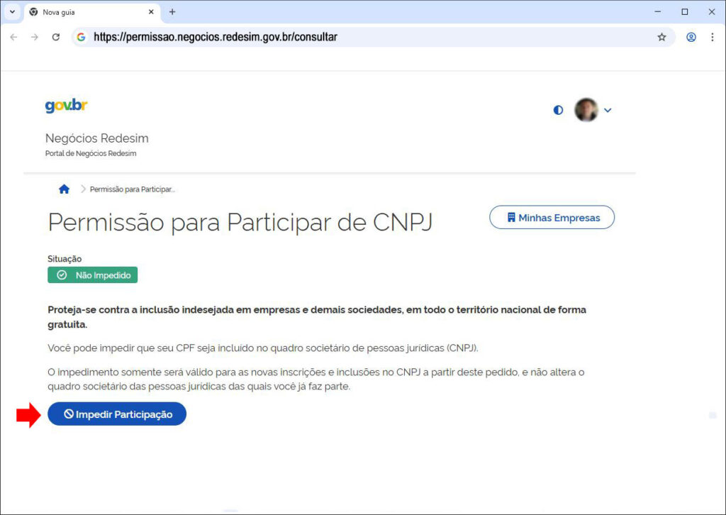 Mais informações no link: https://www.gov.br/pt-br/servicos/impedir-permitir-participacao-do-meu-cpf-no-cadastro-nacional-de-pessoas-juridicas-cnpj